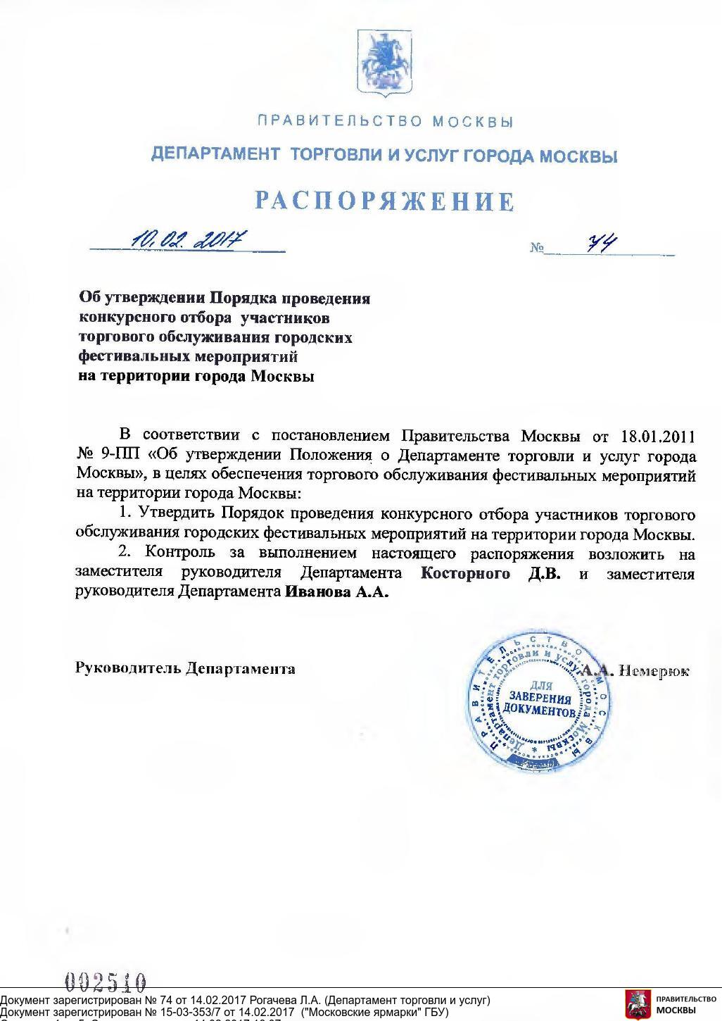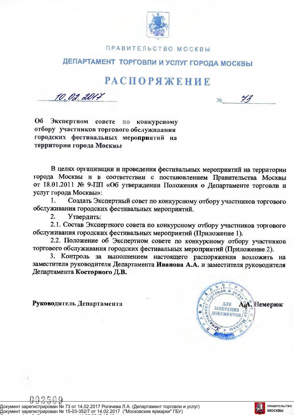 Распоряжение Департамента торговли и услуг города Москвы от 10.02.2017 № 73 «Об Экспертном совете по конкурсному отбору участников торгового обслуживания городских фестивальных мероприятий на территории города Москвы»